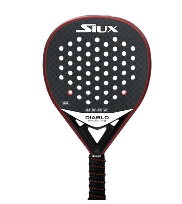 Pala Siux Diablo Revolution Lite 3 formato diamante con cara de Carbono 12K. Con un marco pintado de rojo, esta Siux Diablo Revolution Lite tiene goma EVA en su interior aportando un tacto medio. Además, integra el sistema Dual Poro Grip para mejorar el agarre y reducir las vibraciones. Tiene un balance medio y acabados mate.